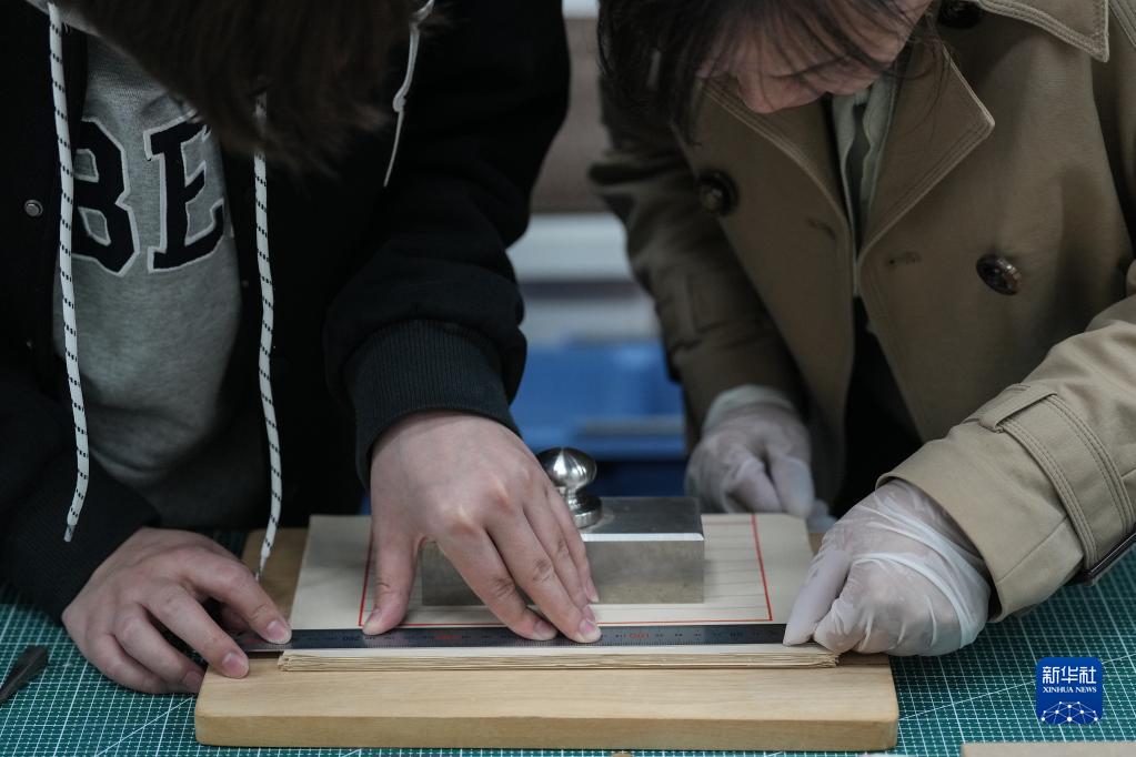 4月20日,王斌在魯迅美術(shù)學(xué)院為文物保護與修復專(zhuān)業(yè)的學(xué)生進(jìn)行線(xiàn)裝書(shū)制作教學(xué)。