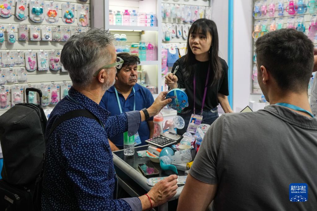 4月23日,采購商在第133屆廣交會(huì )二期孕嬰童展區選購嬰兒奶瓶。