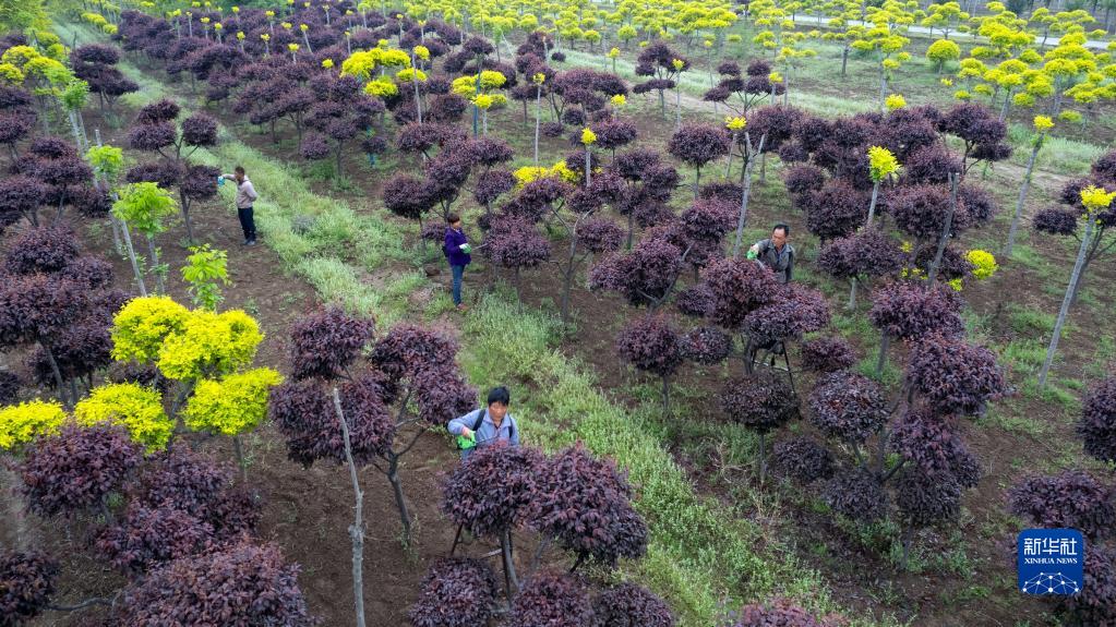 4月23日,在河北省辛集市王口村多彩苗木基地,工作人員在修剪苗木(無(wú)人機照片)。