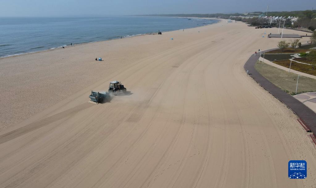 4月23日,工人在秦皇島市海港區金夢(mèng)海灣浴場(chǎng)使用機械設備過(guò)濾海灘上的沙子(無(wú)人機照片)。
