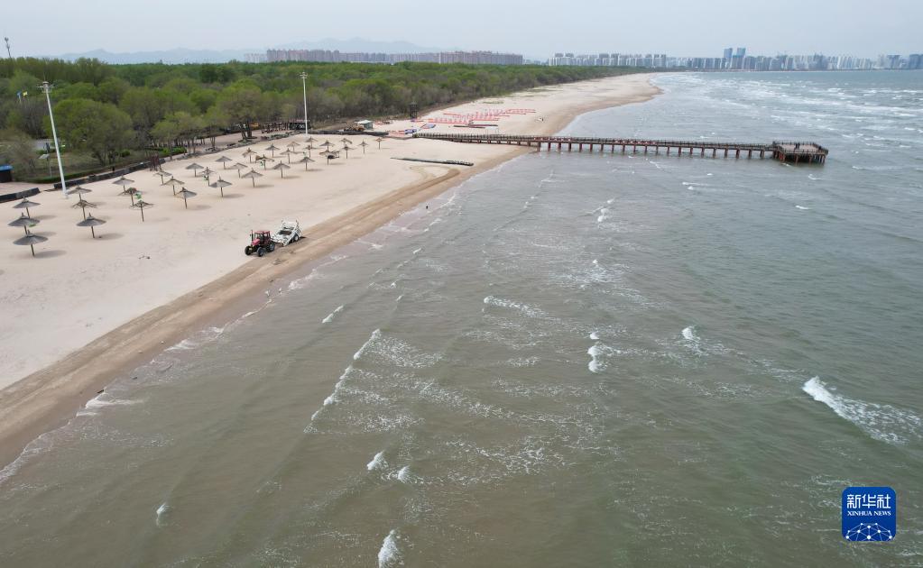 4月23日,工人在秦皇島市北戴河區淺水灣浴場(chǎng)使用機械設備過(guò)濾海灘上的沙子(無(wú)人機照片)。