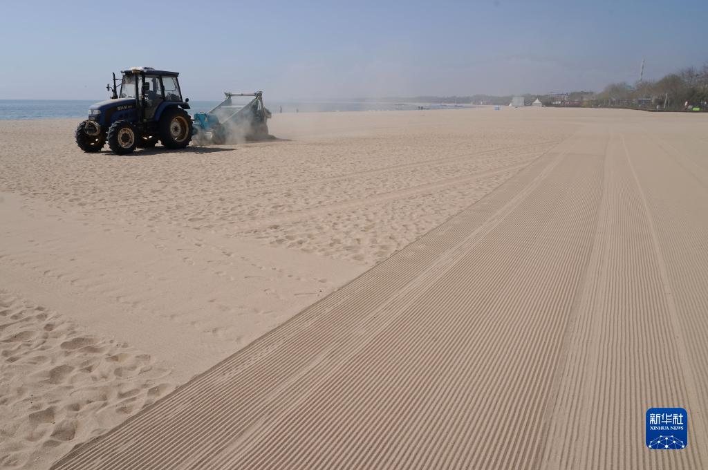 近日,旅游勝地河北省秦皇島市各浴場(chǎng)的工人開(kāi)始對浴場(chǎng)的沙灘進(jìn)行整理,精篩細沙,檢修旅游設備,準備迎接八方來(lái)客。