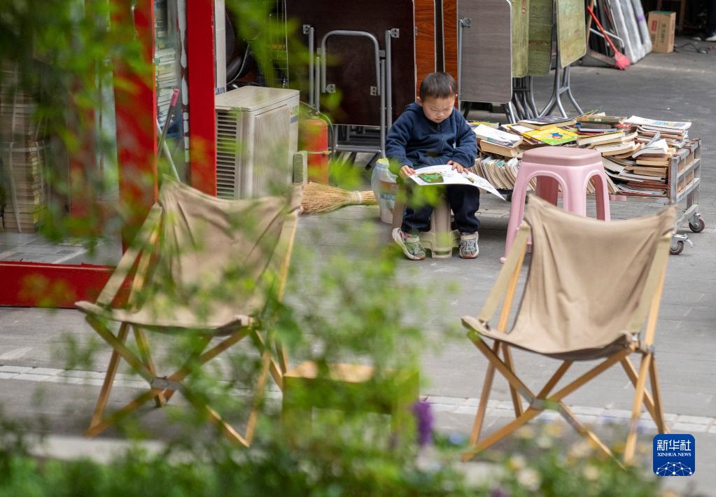 4月22日,一名小朋友在南京市一家二手書(shū)攤讀書(shū)。