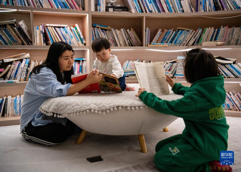 4月20日,在江蘇省東臺市七里漾書(shū)店兒童閱讀專(zhuān)區,家長(cháng)帶領(lǐng)孩子讀書(shū)。
