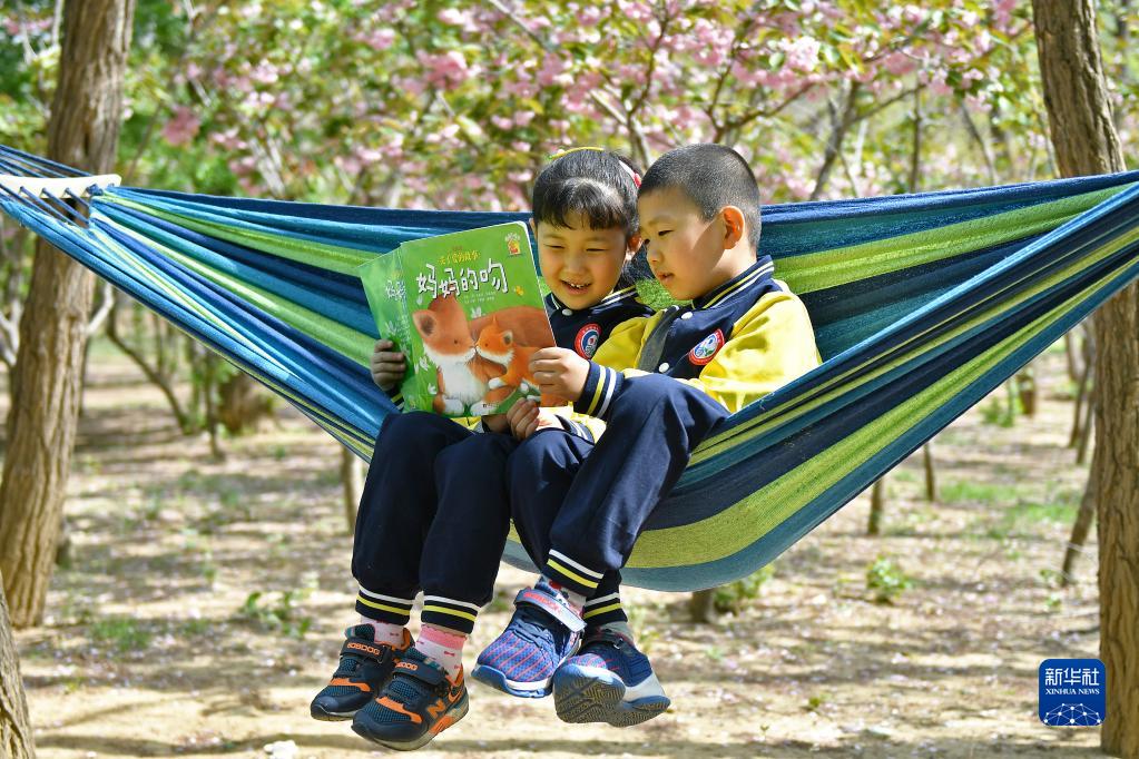 4月20日,山東省煙臺市福山區清洋街道中心幼兒園的小朋友在夾河生態(tài)園閱讀繪本。