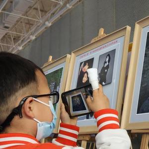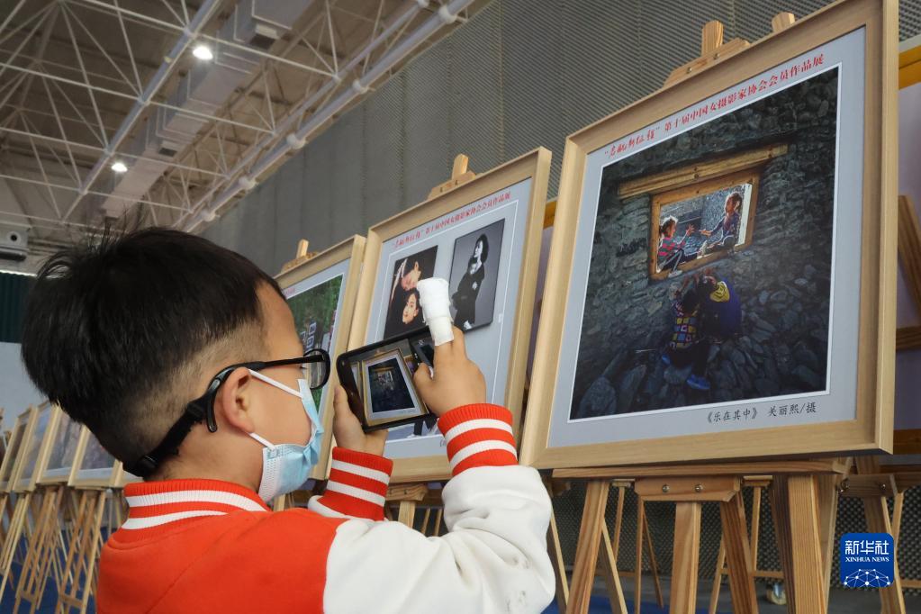 4月23日,小朋友在展覽現場(chǎng)拍攝展出的攝影作品。