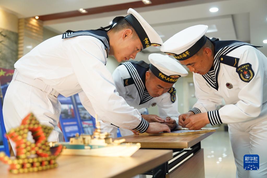 4月23日,東部戰區海軍某電子對抗旅官兵制作手工作品紀念人民海軍成立74周年。新華社發(fā)(高翔龍 攝)