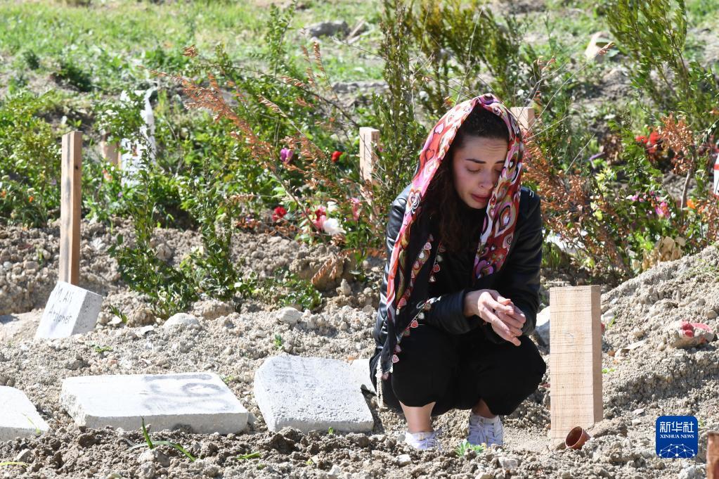 4月23日,一名女子在土耳其哈塔伊一處墓地悼念在地震中遇難的親人。新華社發(fā)(穆斯塔法·卡亞 攝)
