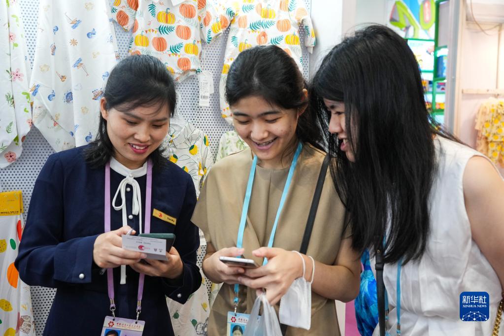 來(lái)自印尼的斯太芬妮·杰斯提娜(中)和妹妹(右)在第133屆廣交會(huì )二期孕嬰童展區和參展商互加微信(4月23日攝)。