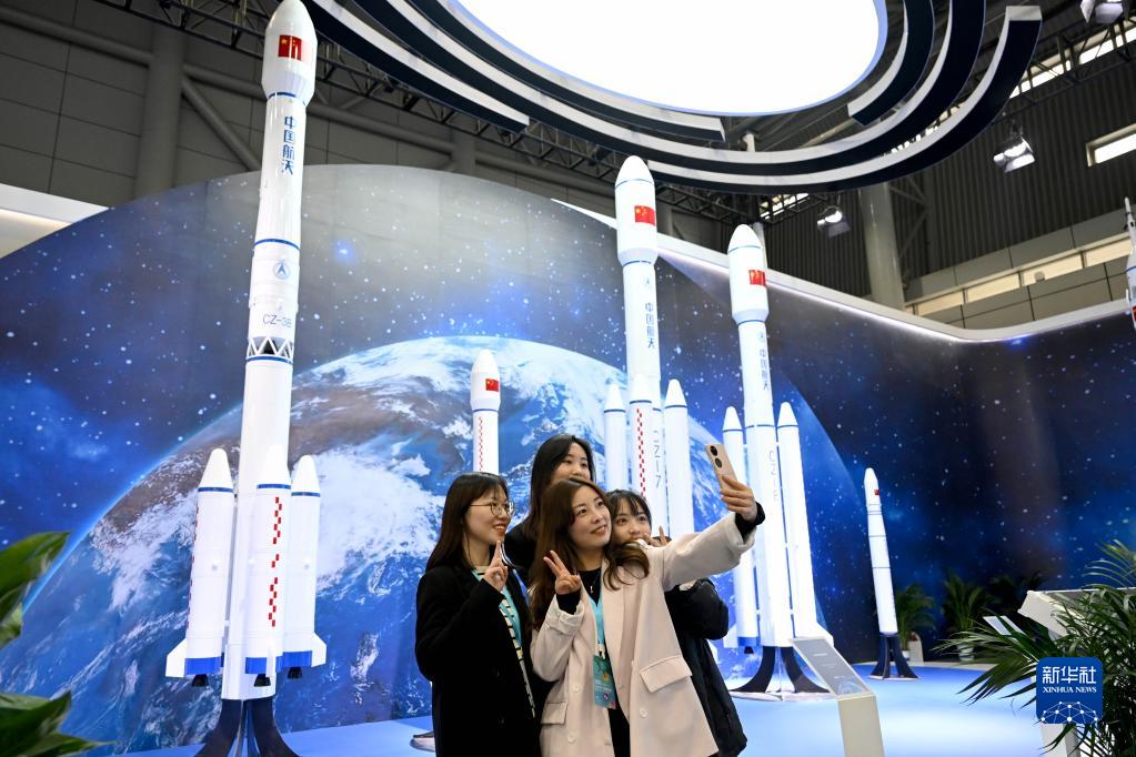 4月24日,觀(guān)眾在2023年“中國航天日”科普展覽上合影留念。
