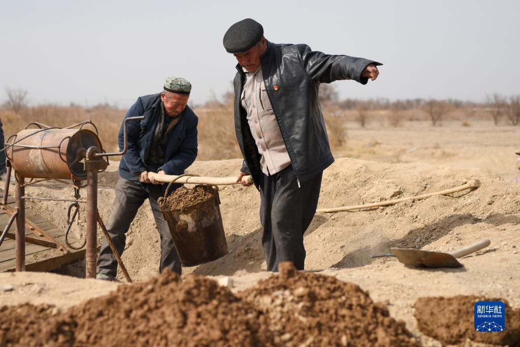 新疆吐魯番市高昌區艾丁湖鎮附近的戈壁灘,花園村掏撈隊隊員傾倒坎兒井內掏出的淤泥(3月9日攝)??矁壕划數厝朔Q(chēng)為“母親河”,由豎井、暗渠、明渠和蓄水池(澇壩)組成,是荒漠地區利用地面坡度無(wú)動(dòng)力引用地下水的一種獨特地下水利工程。