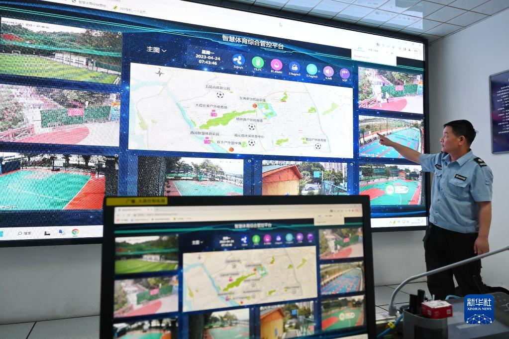 4月24日,西河智慧體育公園工作人員在介紹智慧體育綜合管控平臺。該平臺可對公園內的人流、安全、環(huán)境以及公園周邊“15分鐘健身圈”運動(dòng)場(chǎng)地的門(mén)禁、燈光等設備實(shí)現智能化管理。