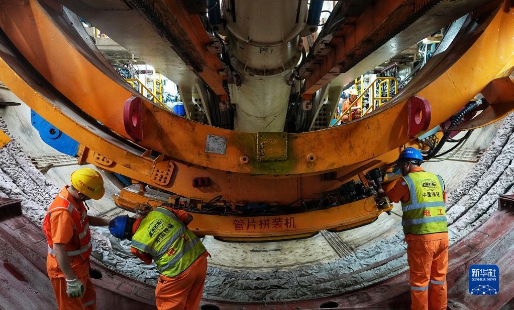 4月24日,中鐵十一局技術(shù)人員檢查準備始發(fā)的“鐵兵廣花13號”盾構機的管片拼裝機。