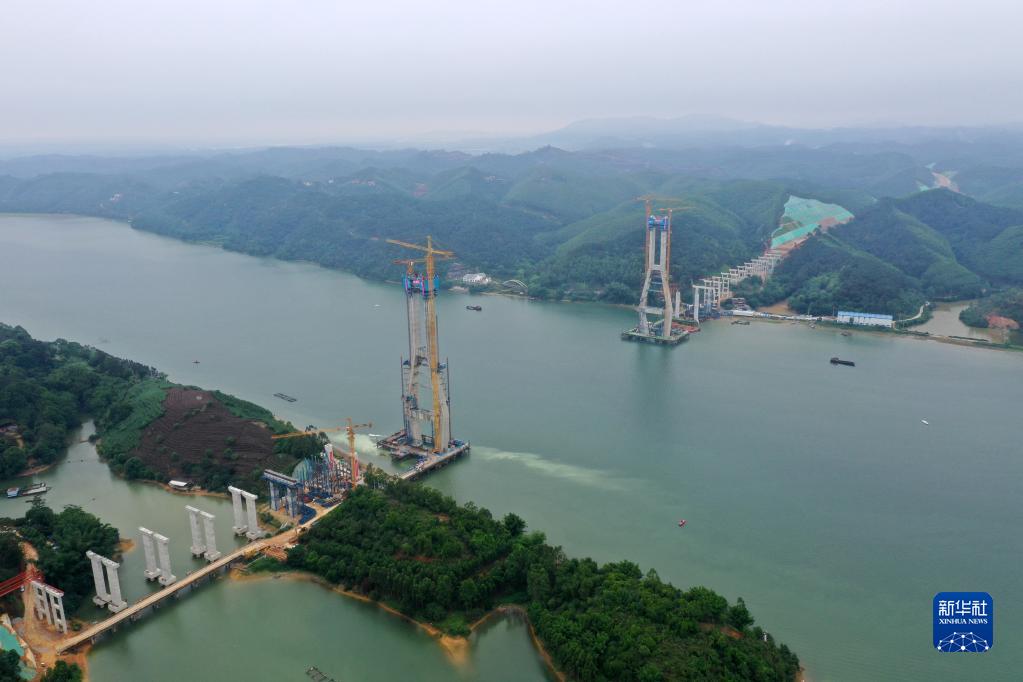這是已經(jīng)實(shí)現主塔封頂的廣西上橫高速公路西津郁江特大橋(4月24日攝,無(wú)人機照片)。