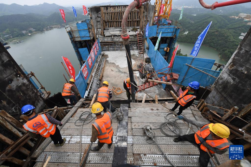 4月24日,在廣西上橫高速公路西津郁江特大橋建設現場(chǎng),中鐵四局集團工人在進(jìn)行主塔封頂施工。