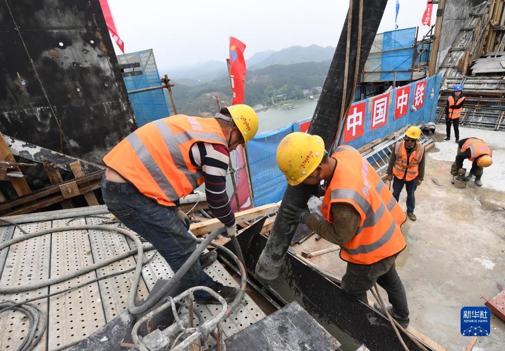 4月24日,在廣西上橫高速公路西津郁江特大橋建設現場(chǎng),中鐵四局集團工人在進(jìn)行主塔封頂施工。
