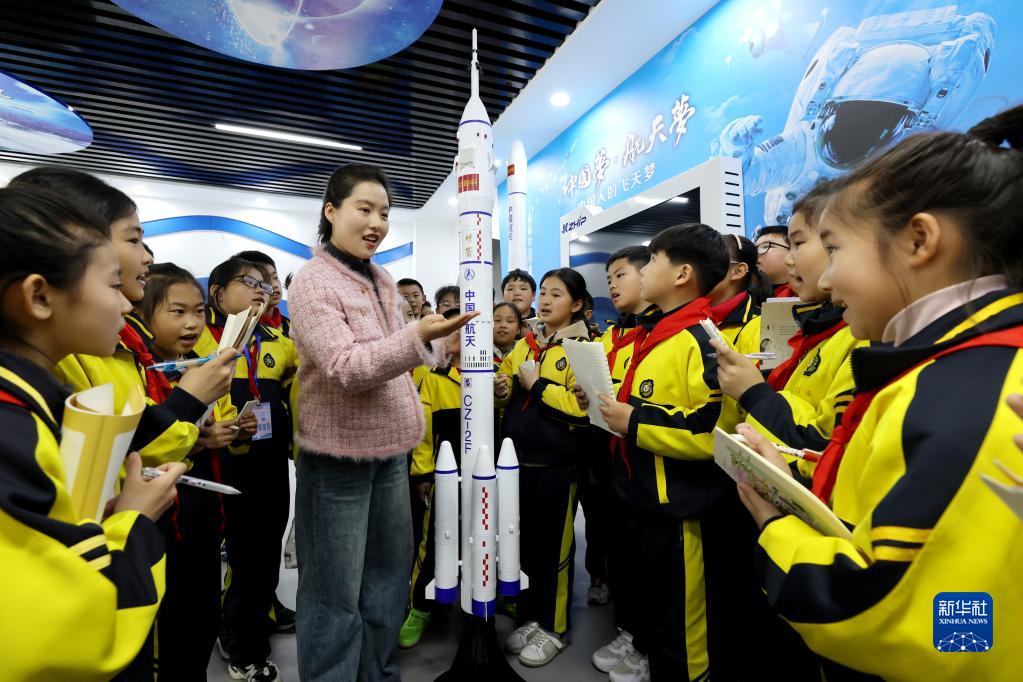 4月24日,在山東省棗莊市文化路小學(xué)航天科普館,老師為學(xué)生們講解航天知識。