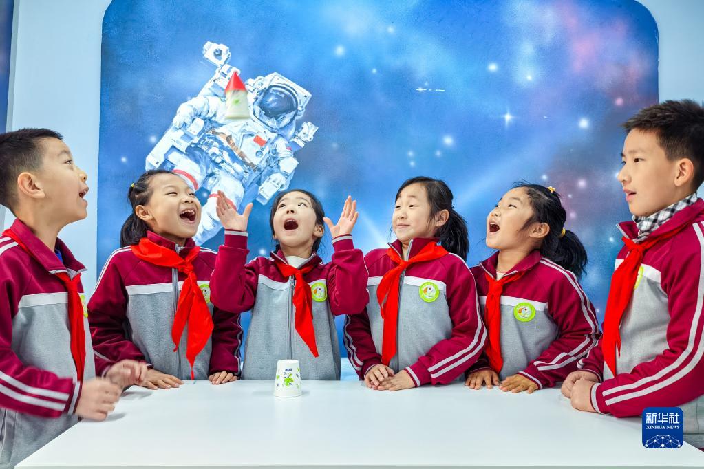 4月24日,在山東青島徐水路小學(xué)科技教室,孩子們體驗“紙杯火箭”實(shí)驗的樂(lè )趣。
