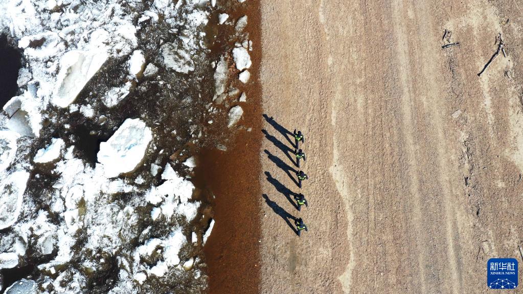 4月24日,黑龍江出入境邊防檢查總站黑河邊境管理支隊大黑河島邊境派出所民警在黑龍江黑河段江岸巡邏,確保安全(無(wú)人機照片)。