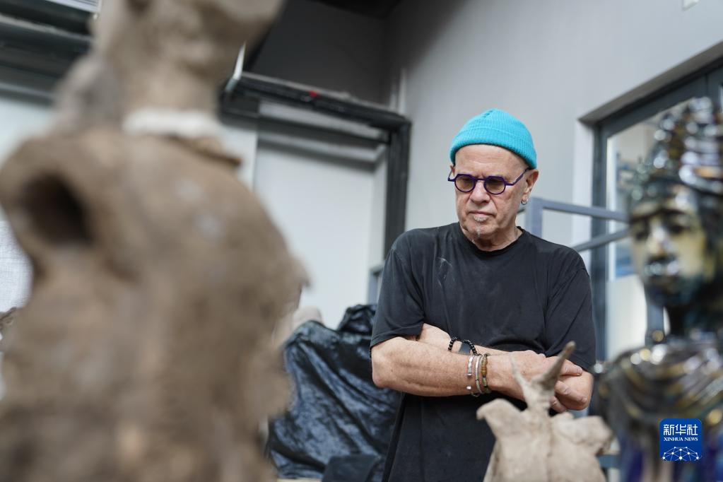 托爾斯滕·尤雷爾在江西景德鎮陶溪川陶瓷文化創(chuàng )意園自己的工作室內觀(guān)察一件正在創(chuàng )作的作品(4月20日攝)。
