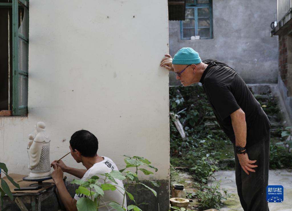 在江西景德鎮雕塑瓷廠(chǎng),托爾斯滕·尤雷爾在觀(guān)摩一名陶瓷師傅創(chuàng )作(4月20日攝)。