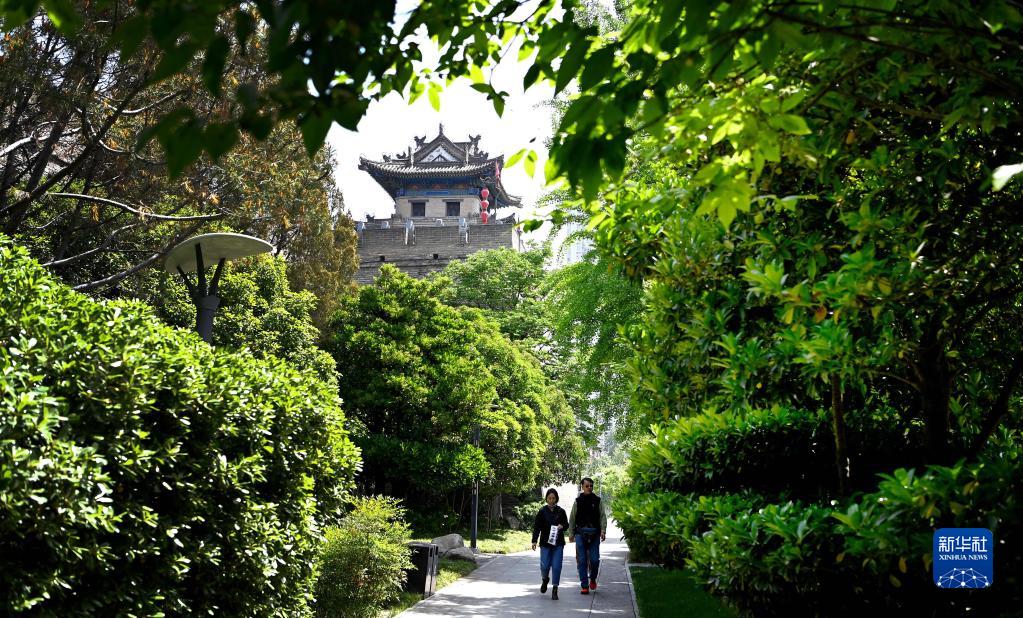 市民在西安明城墻下的環(huán)城公園內散步(4月25日攝)。