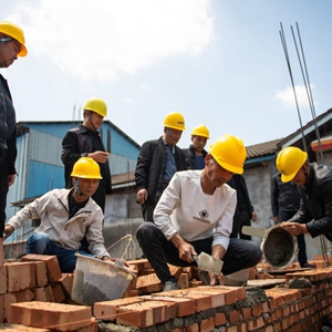 4月25日,在大鯨港鎮五合剅社區,工人在實(shí)操砌墻。