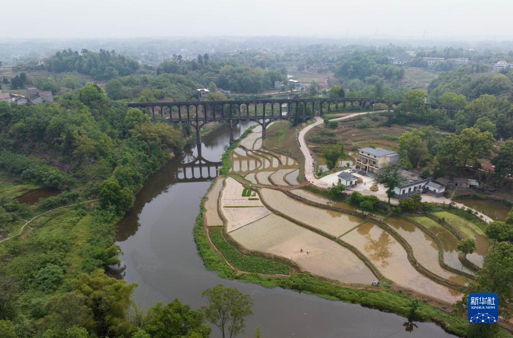 4月25日在瀘縣奇峰鎮拍攝的勝利渡槽(無(wú)人機照片)??缭烬埾拥膭倮刹鄯稚舷聝蓪?,上層通水,下層為人行通道,非常獨特。