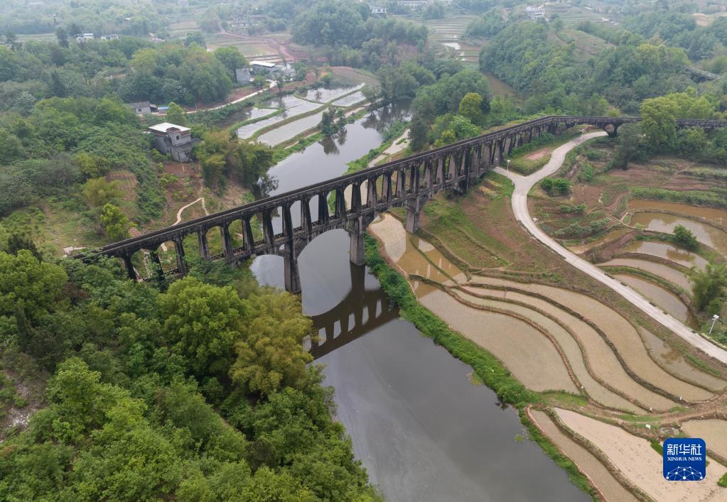 4月25日在瀘縣奇峰鎮拍攝的勝利渡槽(無(wú)人機照片)??缭烬埾拥膭倮刹鄯稚舷聝蓪?,上層通水,下層為人行通道,非常獨特。