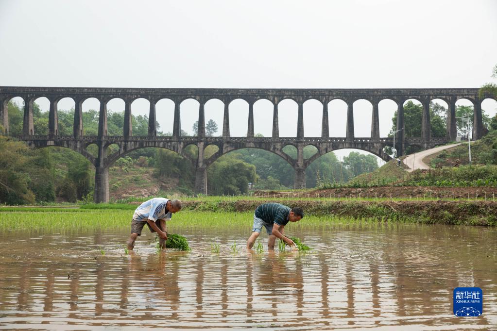 4月25日,在瀘縣奇峰鎮陽(yáng)高村,村民在勝利渡槽附近的水田里插秧。