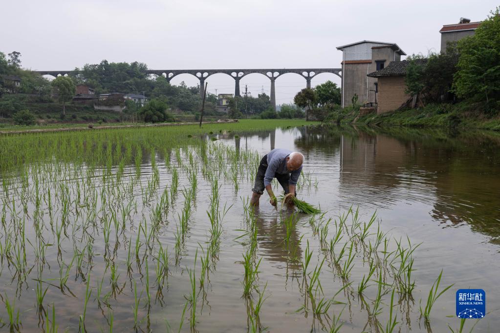 4月25日,在瀘縣奇峰鎮寶豐村,村民在寶藏渡槽附近的水田里插秧。