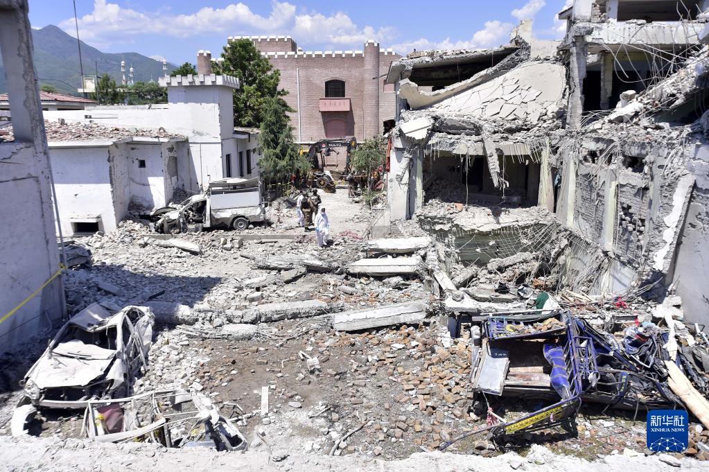 這是4月25日在巴基斯坦斯瓦特地區卡巴爾鎮拍攝的爆炸事件現場(chǎng)。