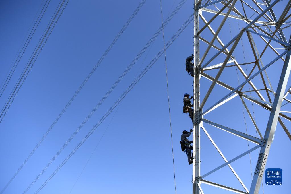 清晨七點(diǎn)多,電力工人劉李家(上)、段信陽(yáng)(下)、王春龍(中)開(kāi)始登塔(4月20日攝)。