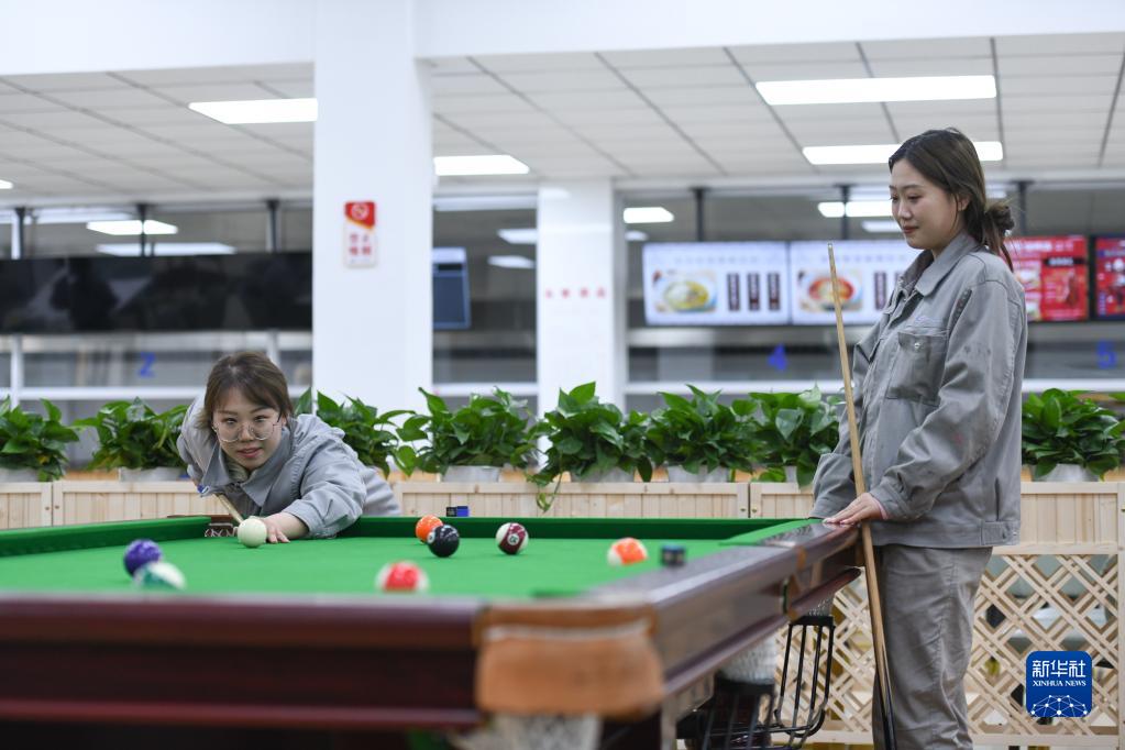 在哈爾濱動(dòng)車(chē)段,于夢(mèng)晗(左)在單位的休閑娛樂(lè )區域與同事康穎昕一同打臺球??捣f昕出生于2002年,去年剛入職的她是“雪絨花”女子班組中年齡最小的(4月25日攝)。