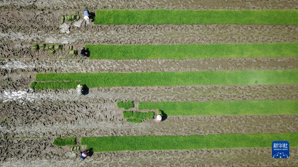 4月26日,在湘潭市雨湖區姜畬鎮易建河村,農民在田間起秧(無(wú)人機照片)。