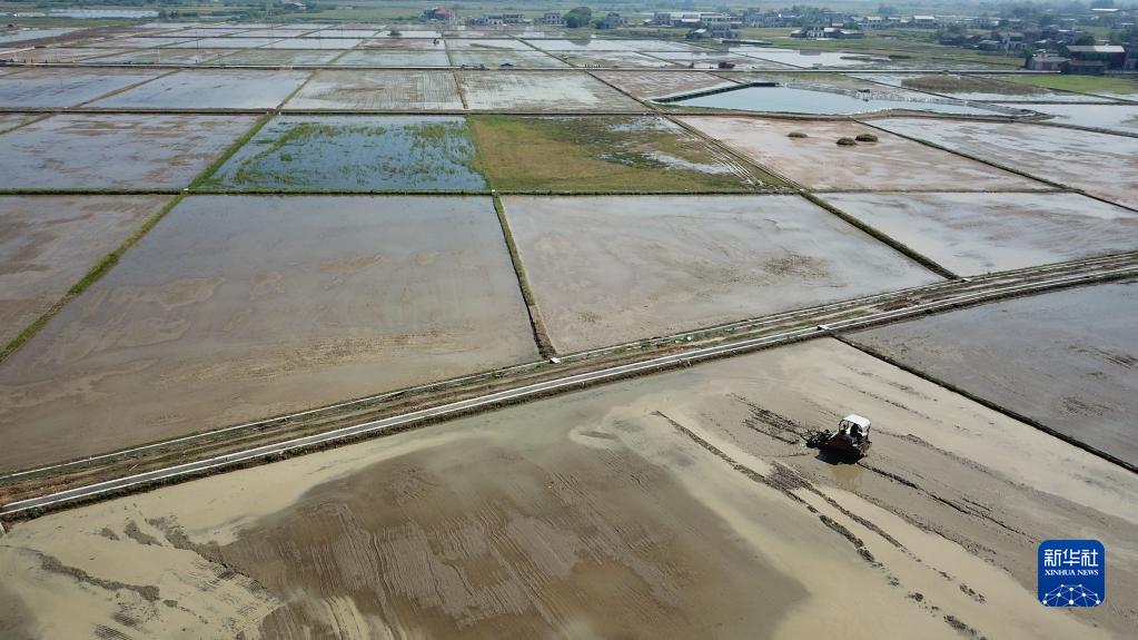 4月26日,在湘潭市雨湖區姜畬鎮易建河村的一處高標準農田,農民駕駛農機進(jìn)行翻田作業(yè)(無(wú)人機照片)。