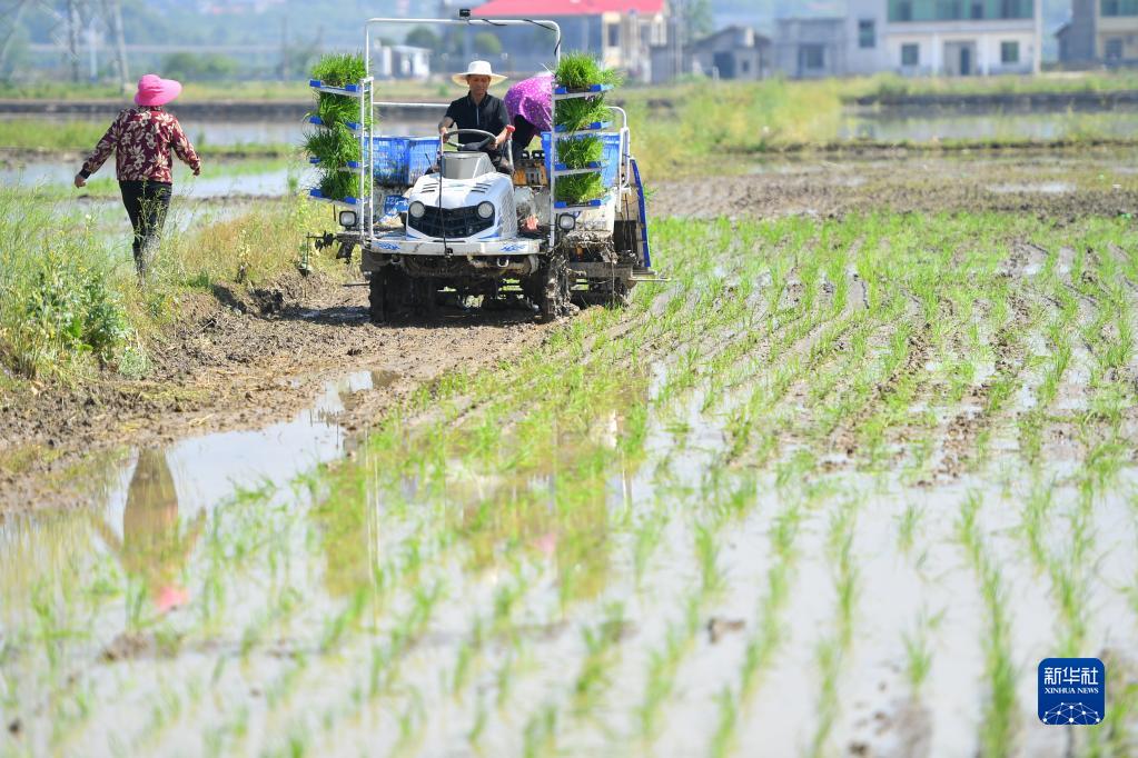 4月26日,在湘潭市雨湖區姜畬鎮易建河村的一處高標準農田,農民駕駛插秧機插秧。