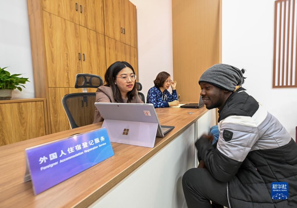 4月26日,在天津工業(yè)大學(xué)出入境事務(wù)服務(wù)中心,學(xué)院輔導員為學(xué)校留學(xué)生更新住宿信息。