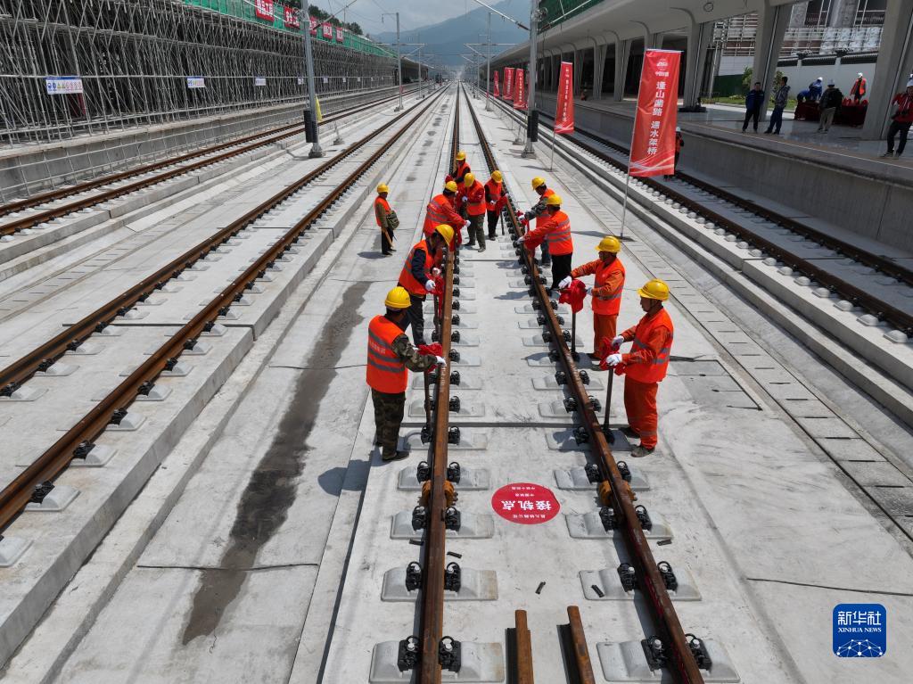 4月26日,在昌景黃高鐵浮梁東站,工作人員在緊固螺栓,將對接好的鋼軌固定。