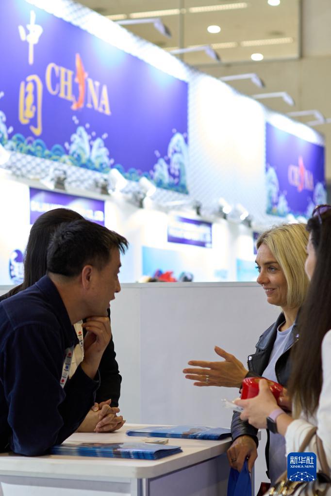 4月25日,在西班牙巴塞羅那舉行的全球水產(chǎn)品博覽會(huì )上,參展商和參觀(guān)者在中國展區洽談。