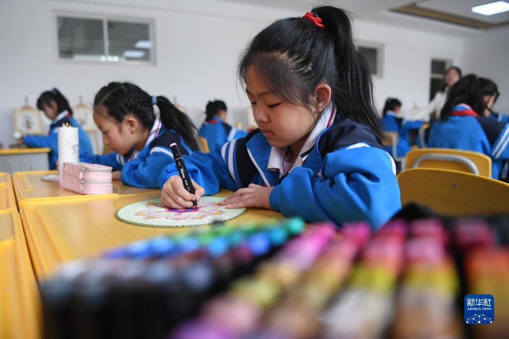 4月26日,在敦煌市西關(guān)小學(xué),美術(shù)社團的學(xué)生在課后服務(wù)時(shí)間進(jìn)行帶有敦煌壁畫(huà)元素的團扇繪畫(huà)。