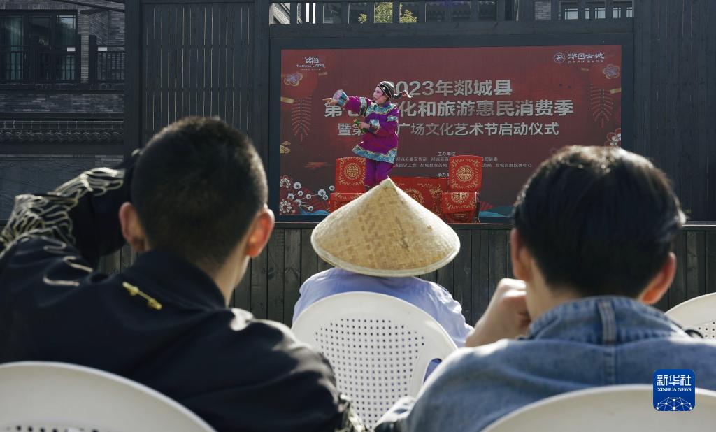 4月26日,在山東省臨沂市郯城縣,游客在郯國古城景區觀(guān)看戲曲表演。