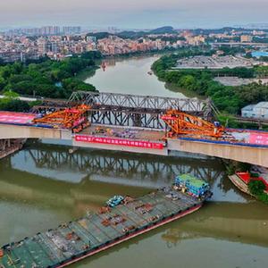 經(jīng)過(guò)中鐵三局施工人員連續6小時(shí)整體吊裝和焊接,廣州白云火車(chē)站流溪河特大橋重達1100噸的鋼箱梁主梁與鋼混連接段于4月27日凌晨順利合龍。流溪河特大橋為京廣高鐵聯(lián)絡(luò )線(xiàn)和廣湛高鐵聯(lián)絡(luò )線(xiàn)四線(xiàn)鐵路并行橋梁。