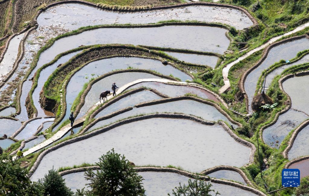 4月26日,在貴州省黔東南苗族侗族自治州從江縣加榜鄉黨扭村,農民牽著(zhù)耕牛走在梯田上。