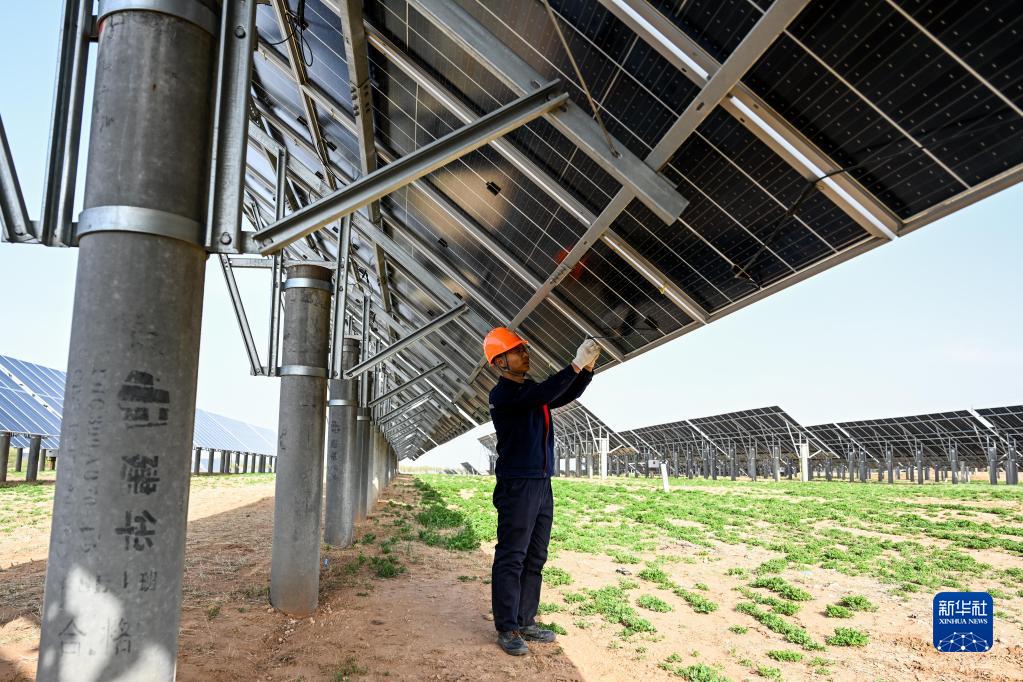 4月26日,工人在天驕綠能50萬(wàn)千瓦光伏項目區內巡查光伏板。