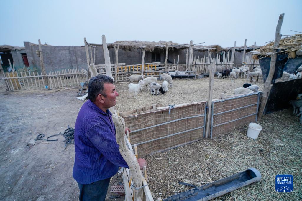 新疆尉犁縣巴西買(mǎi)里村,天色漸暗,忙完農活的爾肯·熱衣木查看自家的羊群(4月21日攝)。