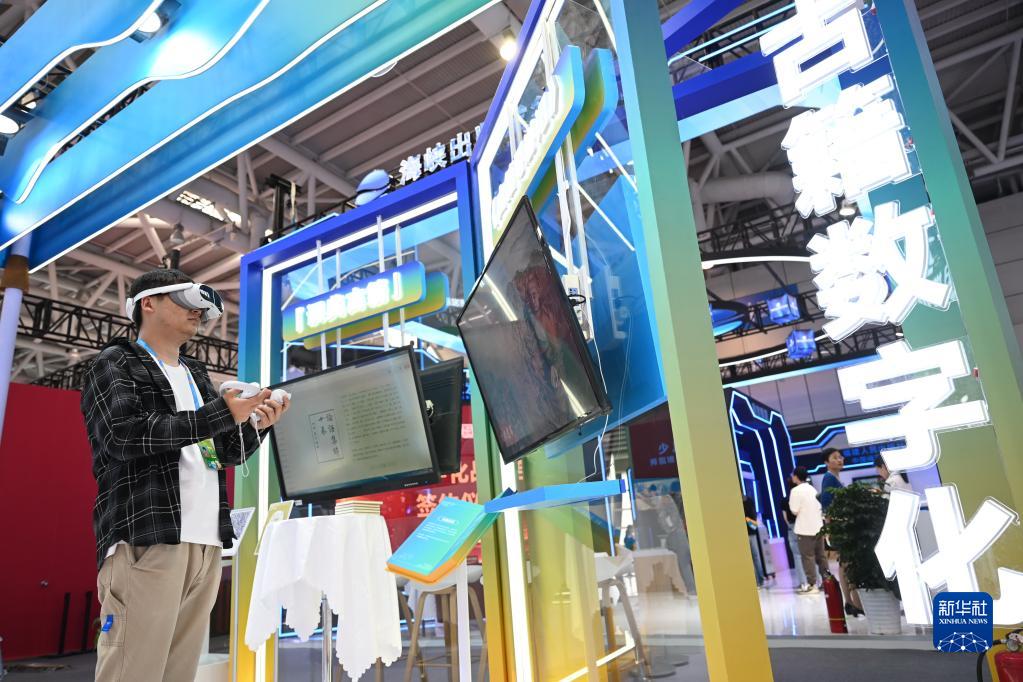 4月27日,參觀(guān)者在第六屆數字中國建設成果展覽會(huì )上體驗古籍數字化VR技術(shù)。