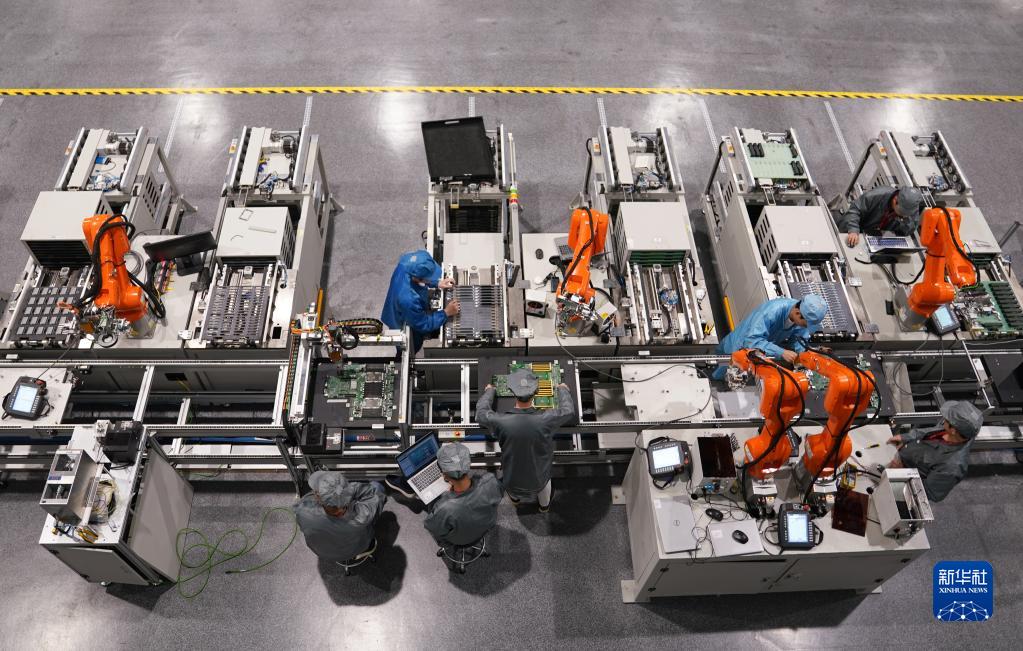 4月27日,在位于浙江杭州市蕭山區的紫光股份信息通信產(chǎn)品未來(lái)工廠(chǎng),技術(shù)人員調試生產(chǎn)線(xiàn)設備。