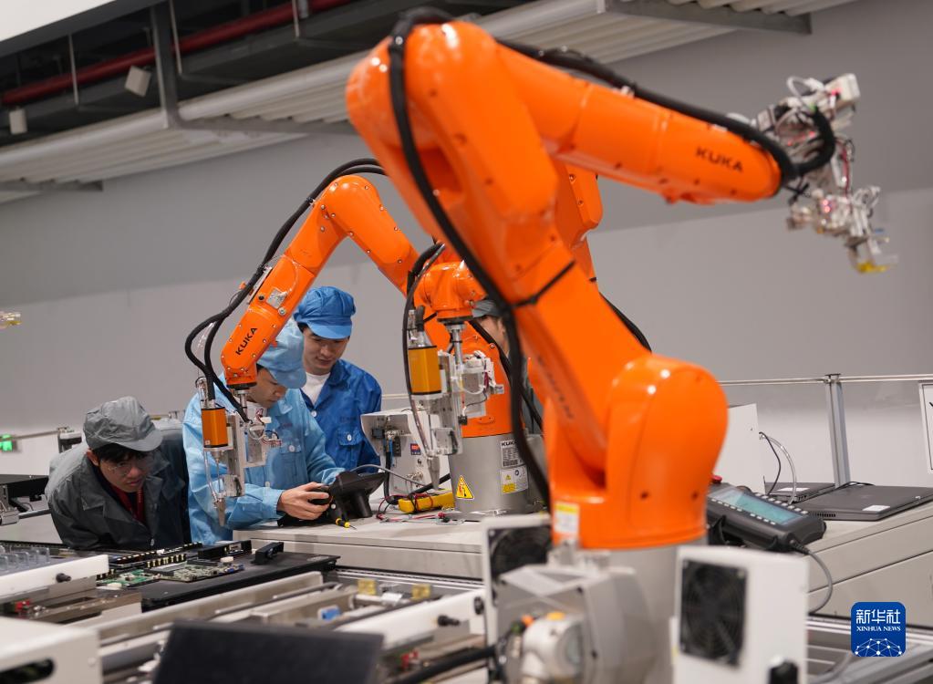 4月27日,在位于浙江杭州市蕭山區的紫光股份信息通信產(chǎn)品未來(lái)工廠(chǎng),技術(shù)人員在調試生產(chǎn)線(xiàn)設備。