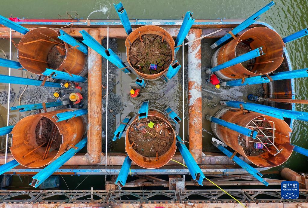 4月27日,施工人員在潭江特大橋樁基承臺進(jìn)行封底施工(無(wú)人機照片)。